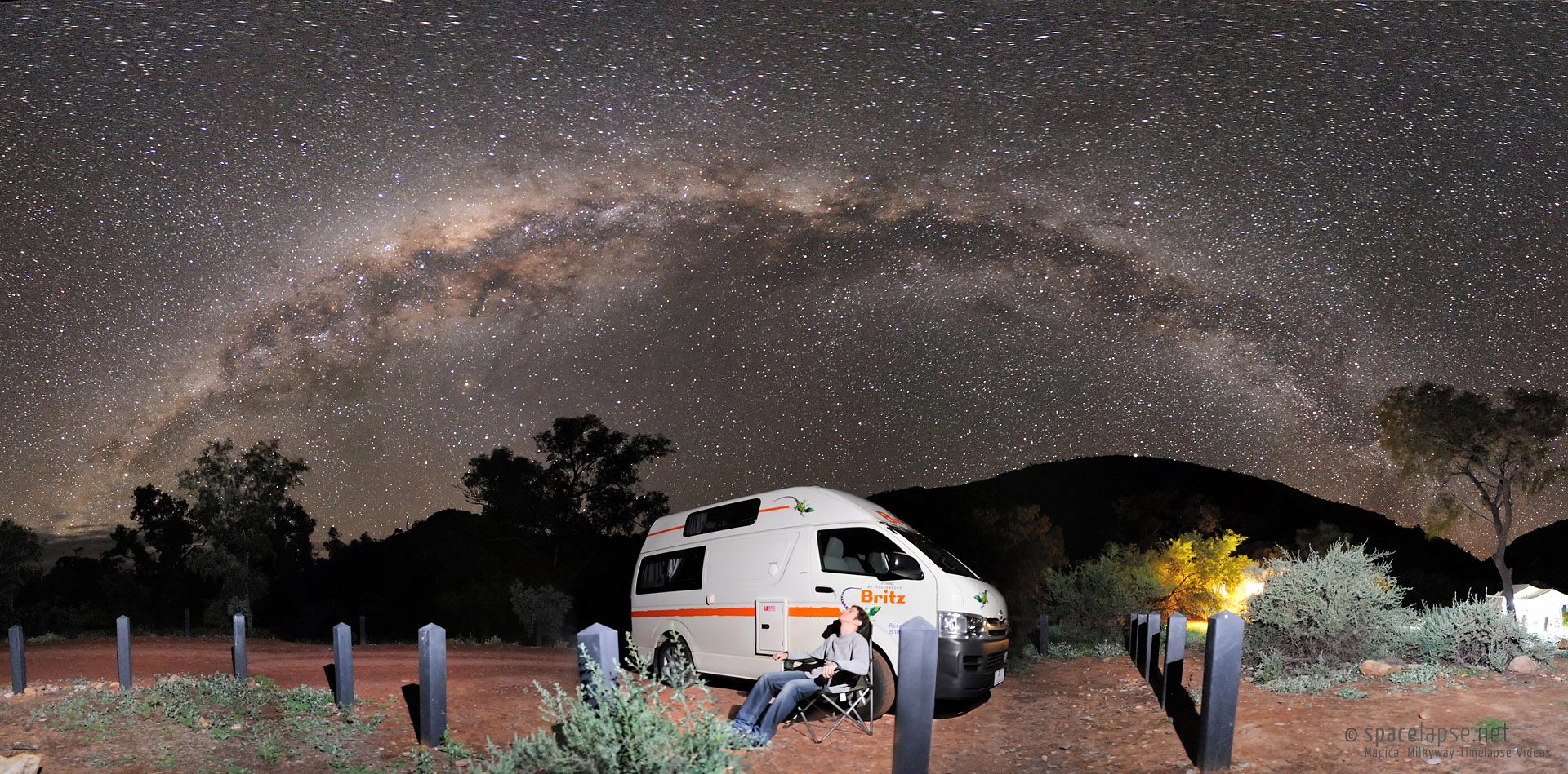 Beschreibung: In Australien findet man wohl einen der schönsten Sternenhimmel der Welt, wenn man ins Outback fährt. Es gibt keine Lichtverschmutzung und die Südhalbkugel bietet eine Fülle von interessanten Himmelsobjekten wie die magellansche Wolken oder bekannte Sternbilder wie das Kreuz des Südens. Kein Wunder also, dass ich den Anblick genieße und die Nacht lieber vor dem Camper, als ihn ihm verbringe. Das Bild ist ein Panorama, welches sich auf 5 Bildern zusammensetzt. Der Vordergrund wurde durch einen externen Blitz aufgehellt.