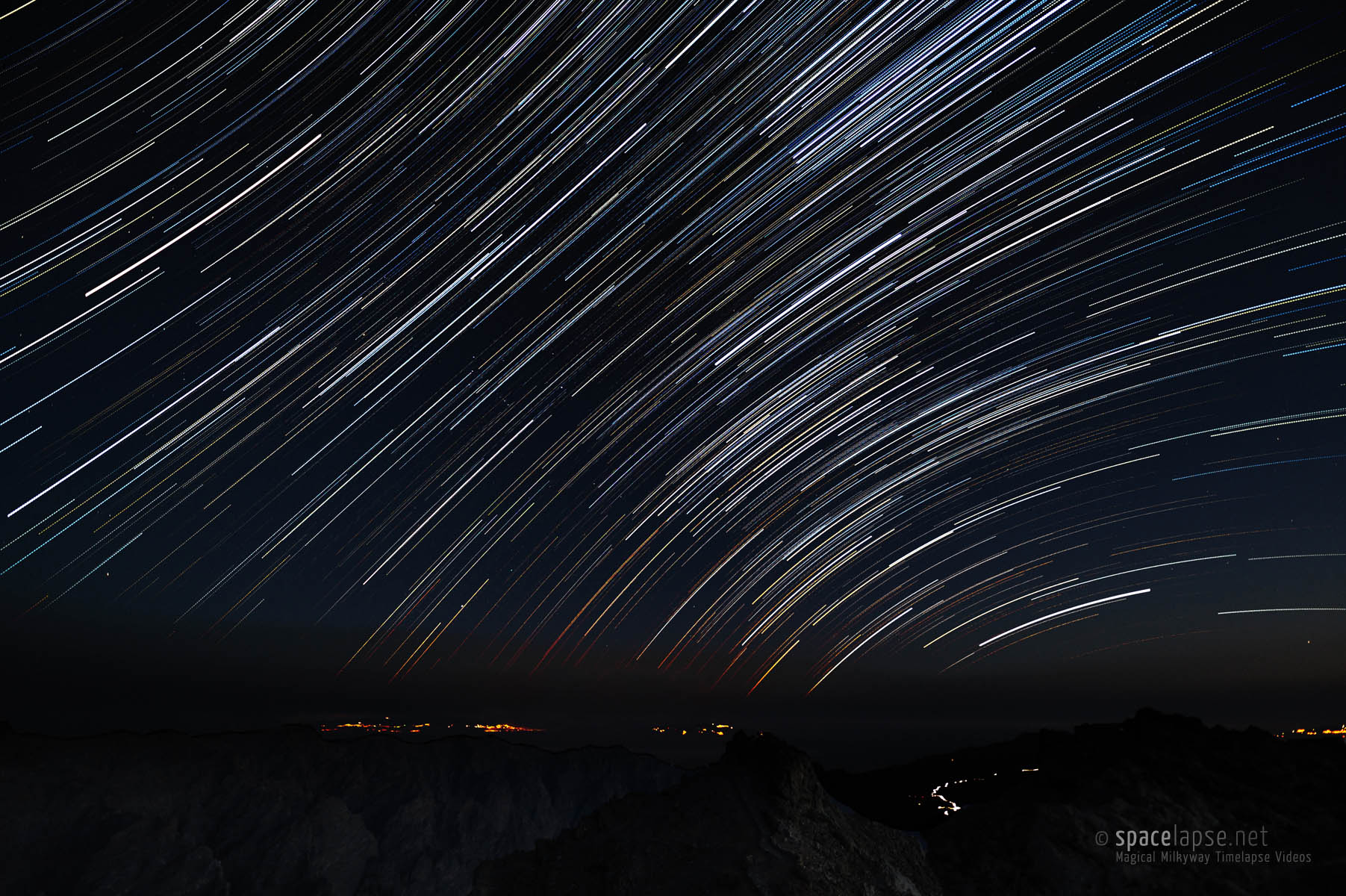 Beschreibung: Über eine gute Stunde hinweg wurde alle 30 Sekunden ein Bild vom Sternenhimmel auf dem Roque de los Muchachos geschossen. Durch das aufeinanderlegen der Einzelbilder wurden dann Sternstrichspuren (Startrails) erzeugt, welche die Bewegung der Sterne darstellen.