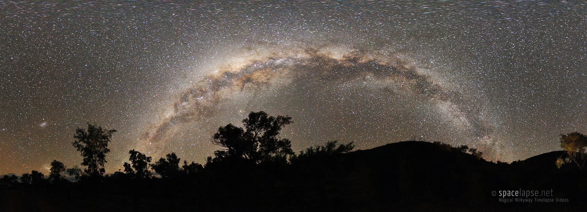 Description: The milky way bends over warth just like a rainbow. With it's huge spectrum of colors and the breathtaking center the milky way offers a spectacular view in Australia. At the left side there are the two magellanic clouds. The panoramic view is stitched togheter of serveral single pictures.
